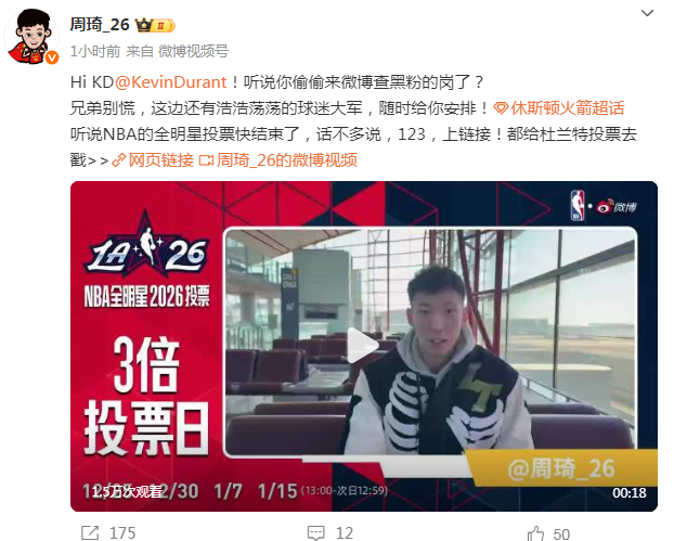 至于如今周琦则是给杜兰特拉票,他录制视频摇旗呐喊,还写道:“Hi KD@KevinDurant!听说你偷偷来微博查黑粉的岗了?兄弟别慌,这边还有浩浩荡荡的球迷大军,随时给你安排!”